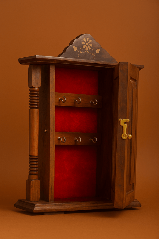 Handcrafted Wooden Key Holder Cabinet – Indian Temple Design Wall Organizer with Glass Door | Traditional Home Decor