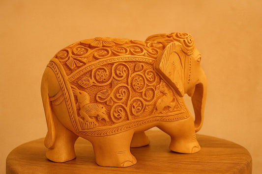 Hand-Carved Wooden Elephant Statue – Intricate Tribal Motif Carving – Traditional Indian Handicraft Home Decor
