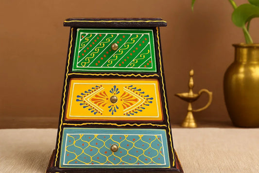 Hand-Painted Wooden 3-Drawer Chest - Indian Artisan Jewelry Box & Trinket Organizer