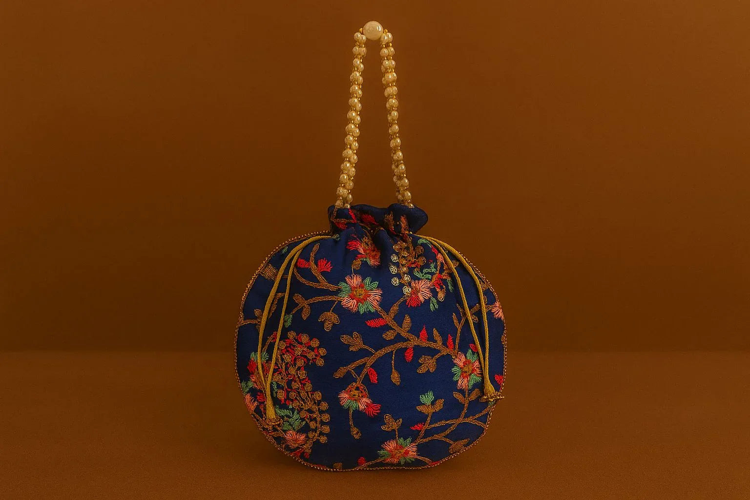 🖌️ Craftsmanship & Design Details This Potli bag is a celebration of Indian needlework. Crafted from premium silk-blend or satin fabric, it serves as a canvas for skilled artisans. The embroidery features delicate vines and flowers in contrasting threads, often highlighted with subtle sequins or zari work. The structure is soft yet durable, maintaining its round shape. The handle is meticulously strung with faux pearls, ensuring it is comfortable to hold while looking incredibly chic.