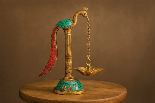 Handcrafted Brass Peacock Diya with Mosaic Stone Inlay - Traditional Indian Oil Lamp for Diwali & Home Decor - Artisan Metal Work with Turquoise Red Stones
