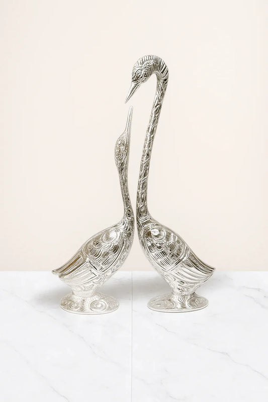 Handcrafted Aluminum Crane Statue Pair – Silver Metal Bird Sculptures for Home Decor | Elegant & Modern