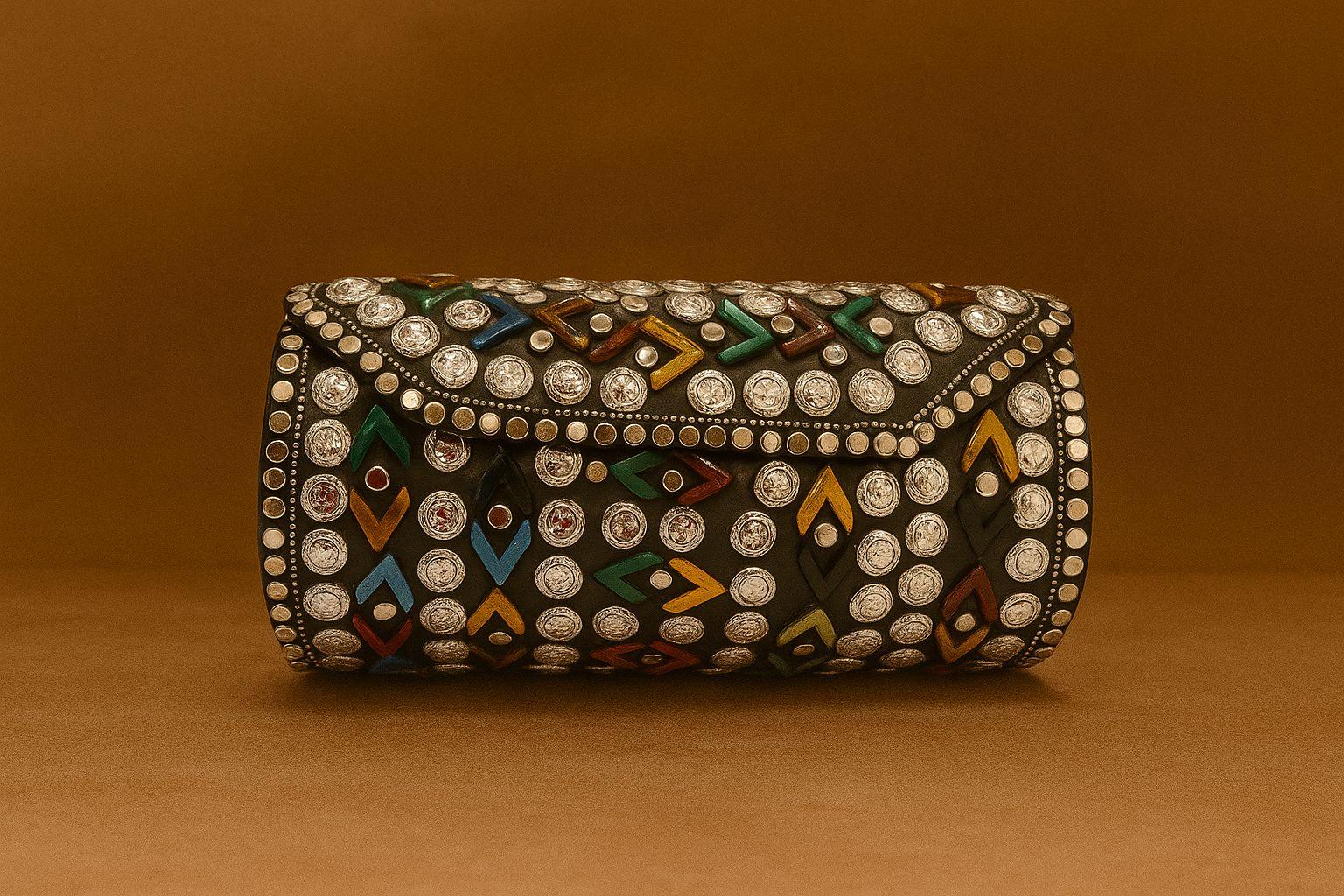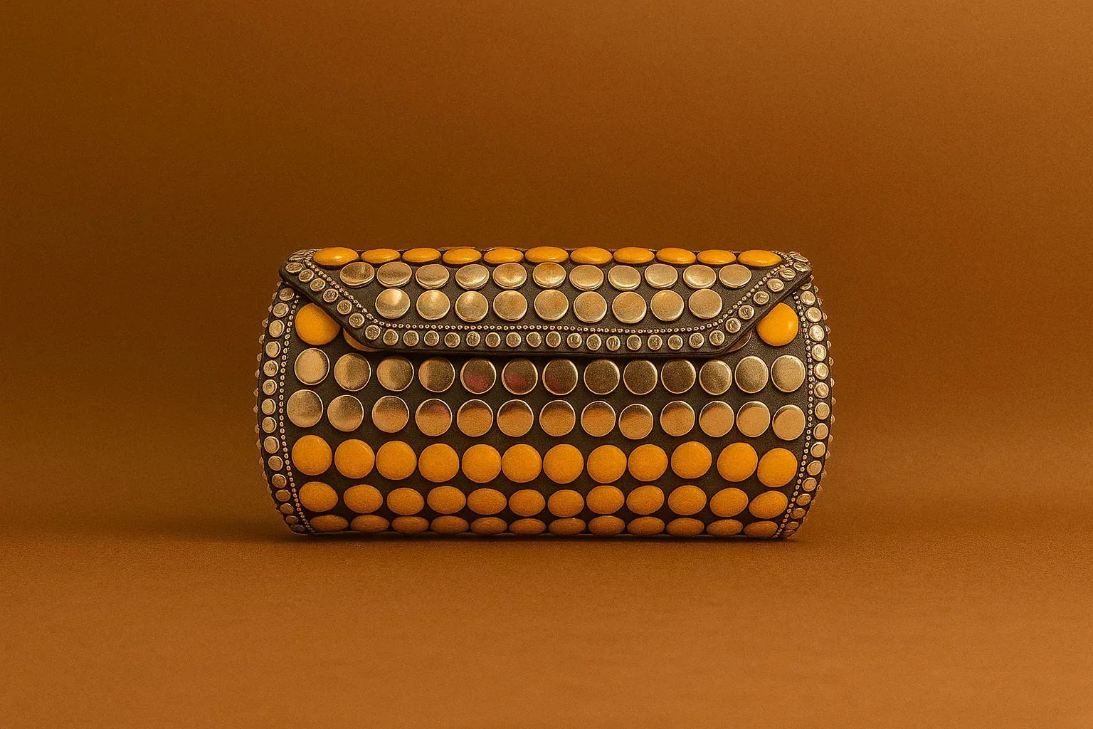 🖌️ Craftsmanship & Design Details These bags are a testament to precision. For the "Retro-Mod" variant, artisans must align the circular studs perfectly to create the linear pattern. For the "Tribal Geo" variant, they carefully arrange diamond-shaped stones and textured metal coins to create a balanced, rhythmic design. The base is sturdy, and the interior is lined with soft fabric to protect your valuables.