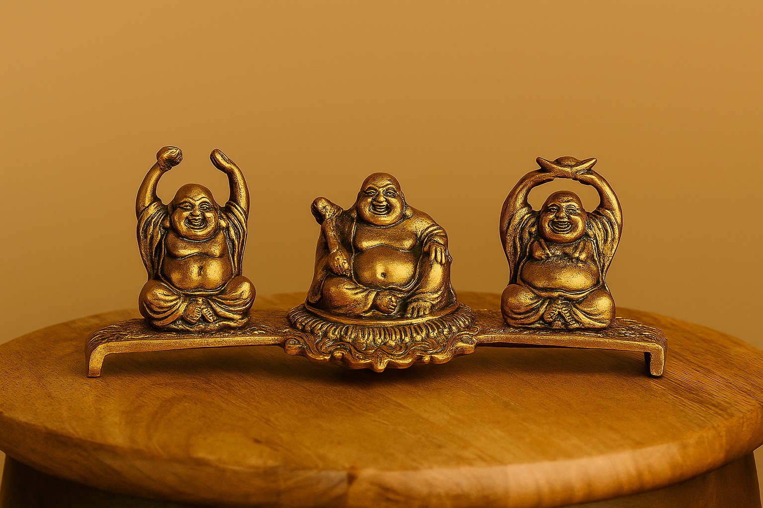 Brass Laughing Buddha Statue Set – Three Happy Buddha Figurines on a Base | Feng Shui Decor for Prosperity & Luck