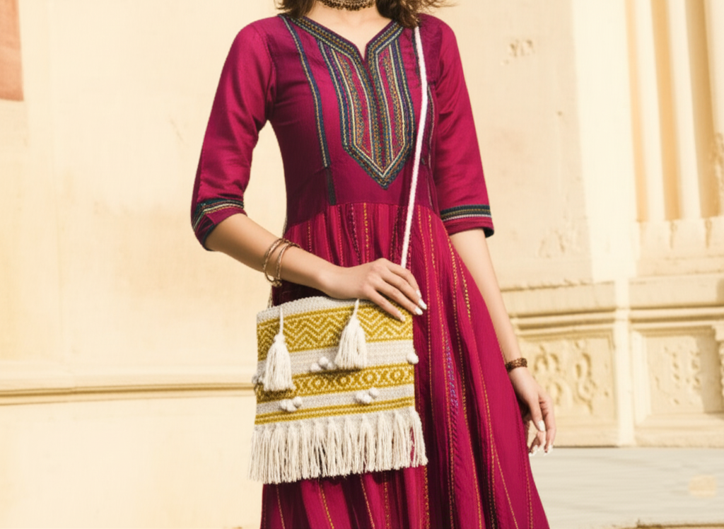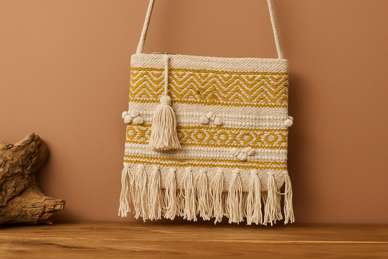 The bag blends geometric weaving in mustard and ivory tones with soft cotton pom-poms and a central tassel. The standout element is its long fringe border, which adds motion and flair. Designed for day-to-night versatility, this crossbody bag pairs effortlessly with ethnic wear, denim, or summer dresses.
